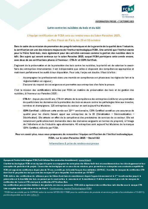 Dans le cadre de sa mission de promotion des progrès techniques et de la garantie de la qualité dans l’industrie, la certification est une des missions majeures de l’Institut technologique FCBA. Une activité que l’Institut exerce pour la filière foret-bois, mais également pour des activités connexes comme la gestion des nuisibles dans le bâti. Des sujets qui seront centraux sur le salon Parasitec 2025, auquel FCBA participera cette année encore, avec deux de ses certifications phares à l’honneur : CTB-A+ et CEPA Certified.