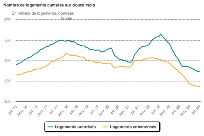 Au cours des douze derniers mois, 272 900 logements seraient mis en chantier, soit 69 000 de moins (- 20,2 %) qu’entre août 2022 et juillet 2023, et 30 % de moins qu’au cours des 12 mois précédant la crise sanitaire (mars 2019 à février 2020).