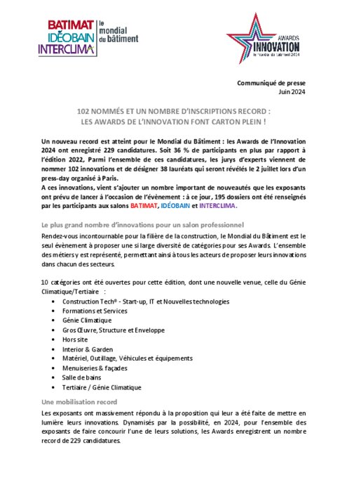 Un nouveau record est atteint pour le Mondial du Bâtiment : les Awards de l’Innovation 2024 ont enregistré 229 candidatures. Soit 36 % de participants en plus par rapport à l’édition 2022. Parmi l’ensemble de ces candidatures, les jurys d’experts viennent de nommer 102 innovations et de désigner 38 lauréats qui seront révélés le 2 juillet lors d’un press-day organisé à Paris.