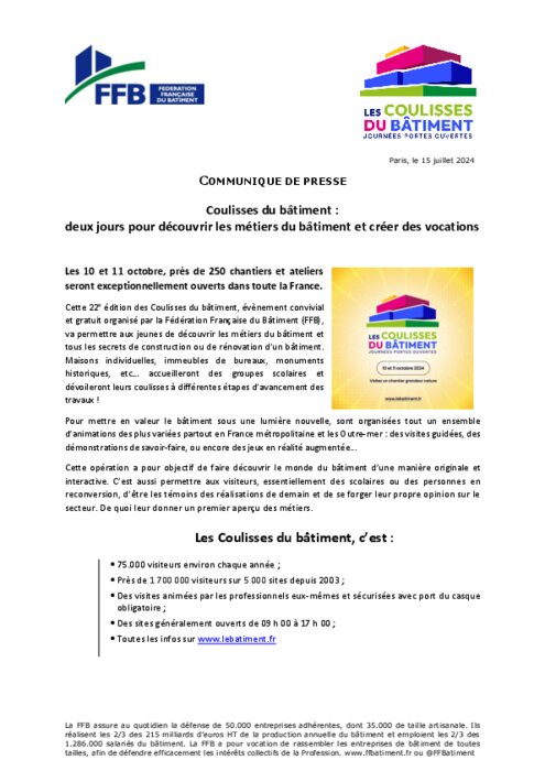 Les 10 et 11 octobre, près de 250 chantiers et ateliers seront exceptionnellement ouverts dans toute la France. Cette 22e édition des Coulisses du bâtiment, évènement convivial et gratuit organisé par la Fédération Française du Bâtiment (FFB), va permettre aux jeunes de découvrir les métiers du bâtiment et tous les secrets de construction ou de rénovation d’un bâtiment. Maisons individuelles, immeubles de bureaux, monuments historiques, etc… accueilleront des groupes scolaires et dévoileront leurs coulisses à différentes étapes d’avancement des travaux.