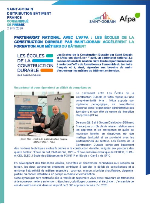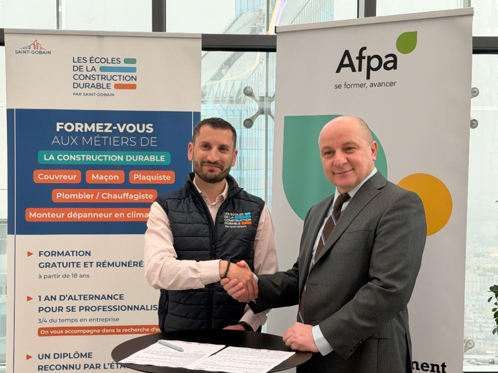 Les Écoles de la Construction Durable par Saint-Gobain et l’Afpa ont signé, le 1er avril, un partenariat national. La consolidation de la relation entre les deux partenaires vise à renforcer l’offre de formation sur l’ensemble du territoire français et à, ainsi, répondre aux besoins de main-d’œuvre sur les métiers du bâtiment en tension.