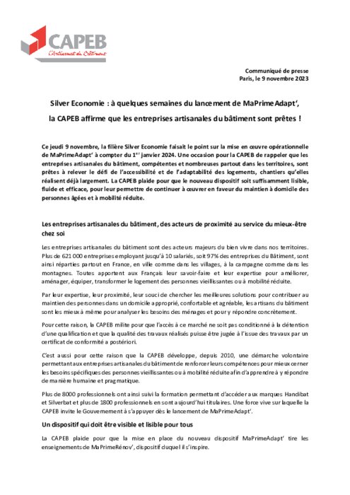Ce jeudi 9 novembre, la filière Silver Economie faisait le point sur la mise en œuvre opérationnelle de MaPrimeAdapt‘ à compter du 1er janvier 2024. Une occasion pour la Capeb de rappeler que les entreprises artisanales du bâtiment, compétentes et nombreuses partout dans les territoires, sont prêtes à relever le défi de l’accessibilité et de l’adaptabilité des logements, chantiers qu’elles réalisent déjà largement.