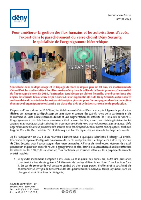 Spécialisée dans le dépolissage et le laquage de flacons depuis plus de 40 ans, les établissements Gérard Pariche sont installés à Bouillancourt-en-Séry dans la vallée de la Bresle, premier pôle mondial du flaconnage de luxe. En 2018, l’entreprise, touchée par un violent incendie, prend conscience des enjeux de sécurité liés aux flux de personnes. Elle se rapproche alors de Dény Security, autre société ambassadrice du savoir-faire historique de la région picarde.