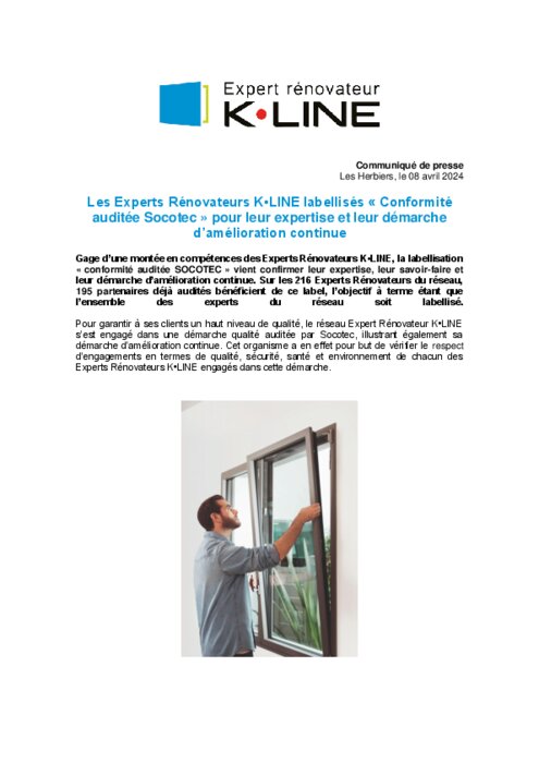 Gage d’une montée en compétences des Experts Rénovateurs K•LINE, la labellisation « conformité auditée SOCOTEC » vient confirmer leur expertise, leur savoir-faire et leur démarche d’amélioration continue. Sur les 216 Experts Rénovateurs du réseau, 195 partenaires déjà audités bénéficient de ce label, l’objectif à terme étant que l’ensemble des experts du réseau soit labellisé.