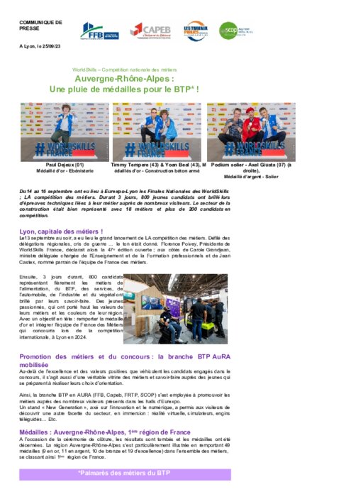 Du14 au 16 septembre ont eu lieu à Eurexpo-Lyon les Finales Nationales des WorldSkills ; LA compétition des métiers. Durant 3 jours, 800 jeunes candidats ont brillé lors d’épreuves techniques liées à leur métier auprès de nombreux visiteurs. Le secteur de la construction était bien représenté avec 18 métiers et plus de 200 candidats en compétition.