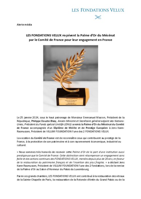 Le 25 janvier 2024, sous le haut patronage de Monsieur Emmanuel Macron, Président de la République, Philippe Douste-Blazy, Ancien Ministre et Secrétaire général adjoint des Nations-Unies, Président du Fonds spécial Unitlife (ONU) a remis la Palme d’Or du Mécénat du Comité de France accompagnée d’un Diplôme de Mérite et de Pres9ge Européen à Jens Kann-Rasmussen, Président de VILLUM FOUNDATION l’une des 2 FONDATIONS VELUX.