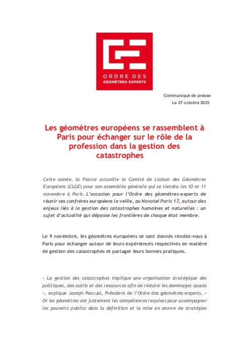 Cette année, la France accueille le Comité de Liaison des Géomètres Européens (CLGE) pour son assemblée générale qui se tiendra les 10 et 11 novembre à Paris. L’occasion pour l’Ordre des géomètres-experts de réunir ses confrères européens la veille, au Novotel Paris 17, autour des enjeux liés à la gestion des catastrophes humaines et naturelles : un sujet d’actualité qui dépasse les frontières de chaque état membre.