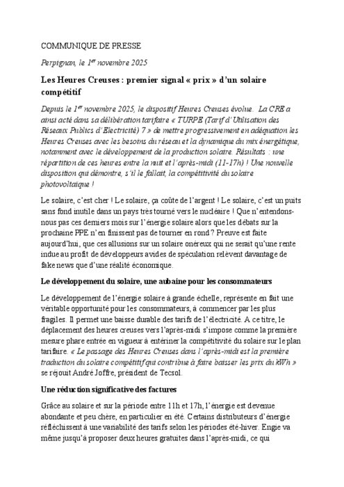 Le développement de l’énergie solaire à grande échelle, représente en fait une véritable opportunité pour les consommateurs, à commencer par les plus fragiles. Il permet une baisse durable des tarifs de l’électricité. A ce titre, le déplacement des heures creuses vers l’après-midi s’impose comme la première mesure phare entrée en vigueur à entériner la compétitivité du solaire sur le plan tarifaire. « Le passage des Heures Creuses dans l’après-midi est la première traduction du solaire compétitif qui contribue à faire baisser les prix du kWh » se réjouit André Joffre, président de Tecsol.