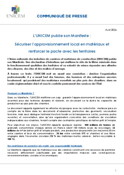 L’Union nationale des industries de carrières et matériaux de construction (Unicem) publie son Manifeste. Une déclaration d’intentions qui réaffirme le rôle de la filière minérale dans le fonctionnement quotidien des territoires et sa volonté de mieux répondre aux attentes des citoyens, des élus et des maîtres d’ouvrage.
