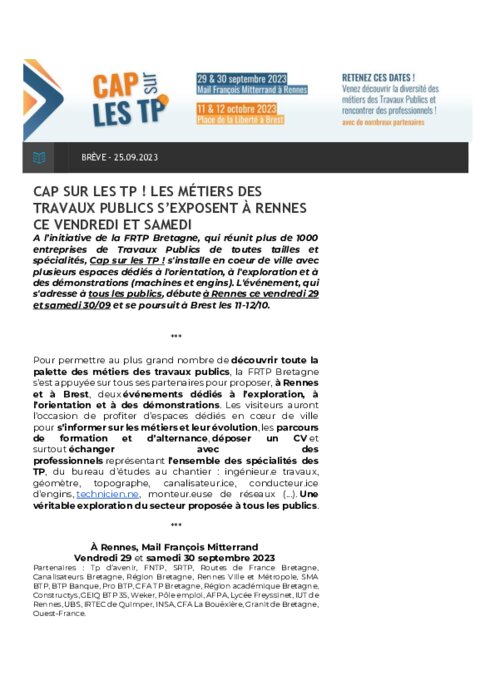 A l’initiative de la FRTP Bretagne, qui réunit plus de 1000 entreprises de Travaux Publics de toutes tailles et spécialités, Cap sur les TP ! s'installe en coeur de ville avec plusieurs espaces dédiés à l'orientation, à l'exploration et à des démonstrations (machines et engins). L'événement, qui s'adresse à tous les publics, débute à Rennes ce vendredi 29 et samedi 30/09 et se poursuit à Brest les 11-12/10.