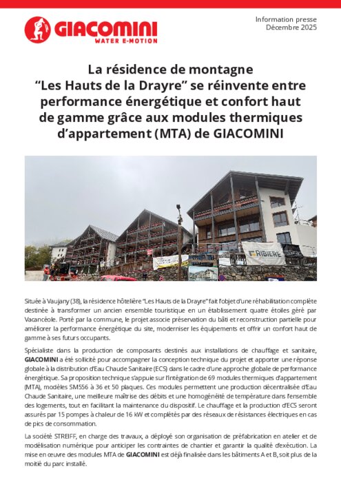 Située à Vaujany (38), la résidence hôtelière “Les Hauts de la Drayre” fait l’objet d’une réhabilitation complète destinée à transformer un ancien ensemble touristique en un établissement quatre étoiles géré par Vacancéole. Spécialiste dans la production de composants destinés aux installations de chauffage et sanitaire, GIACOMINI a été sollicité pour accompagner la conception technique du projet et apporter une réponse globale à la distribution d’eau chaude sanitaire (ECS) dans le cadre d’une approche globale de performance énergétique.