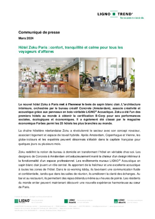 Le nouvel hôtel Zoku à Paris met à l’honneur le bois de sapin blanc clair. L’architecture intérieure, orchestrée par le bureau créatif Concrete (Amsterdam), associe créativité et acoustique grâce aux panneaux en bois véritable LIGNO Acoustique. Zoku a été l’un des premiers hôtels au monde à obtenir la certification B-Corp pour ses performances