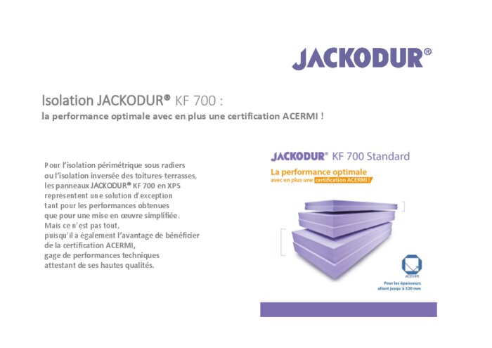 Pour l’isolation périmétrique sous radiers ou l’isolation inversée des toitures-terrasses, les panneaux JACKODUR KF 700 en XPS représentent une solution d’exception tant pour les performances obtenues que pour une mise en œuvre simplifiée. Mais ce n’est pas tout, puisqu’il a également l’avantage de bénéficier de la certification ACERMI, gage de performances techniques attestant de ses hautes qualités.