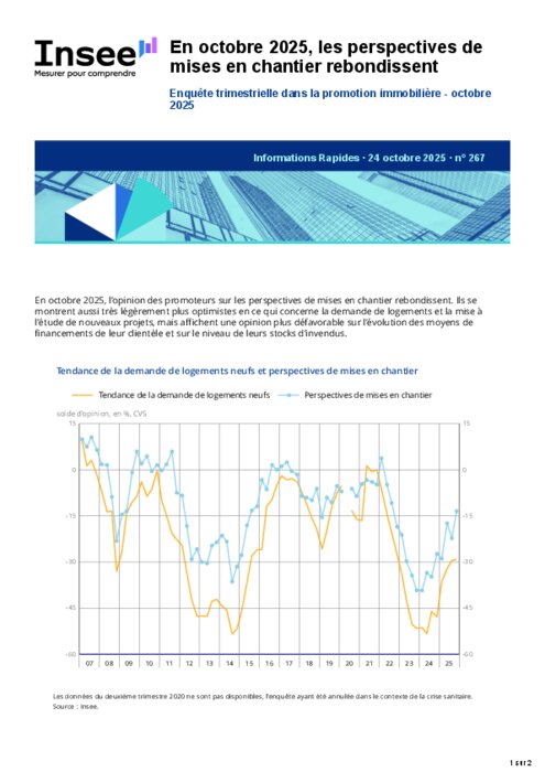 En octobre 2025, l’opinion des promoteurs sur les perspectives de mises en chantier rebondissent. Ils se montrent aussi très légèrement plus optimistes en ce qui concerne la demande de logements et la mise à l’étude de nouveaux projets, mais attachent une opinion plus défavorable sur l’évolution des moyens de financements de leur clientèle et sur le niveau de leurs stocks d’invendus.
