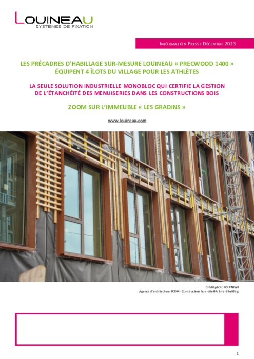 Industriels 15 décembre 2023 - 14:14 LOUINEAU, spécialiste des fixations et habillages pour menuiseries, participe à la construction de ce programme ambitieux. Il intervient sur 4 îlots qui seront équipés de 3 050 précadres d’habillage monoblocs sur-mesure PrecWood 1400. PDF (852 Ko) Télécharger