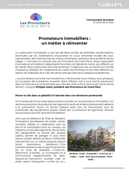 « Les promoteurs sont prêts à se transformer, à faire évoluer leurs métiers, leurs pratiques, et à proposer des prestations nouvelles. Notre réflexion vise à nous inscrire pleinement dans ces évolutions et à les anticiper pour être des acteurs de la construction de la ville de demain » souligne Philippe Jarlot, président des Promoteurs du Grand Paris.
