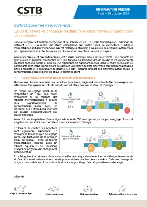 À la fois technique et comportementale, cette étude s’articule autour de deux volets : une enquête en ligne auprès d’un panel représentatif de 1 000 français sur les habitudes de douche et les équipements présents dans leur domicile, ainsi qu’une expérience en conditions réelles, dans le cadre de laquelle 40 participants sont venus prendre leurs douches en laboratoire, testant différentes combinaisons possibles entre 4 robinets et 2 pommeaux de douche. Objectif : mesurer l’impact des différents systèmes sur la consommation d'eau et d'énergie et sur le confort ressenti.