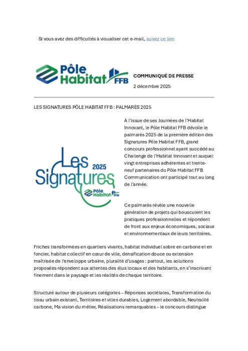 A l’issue de ses Journées de l’Habitat Innovant, le Pôle Habitat FFB dévoile le palmarès 2025 de la première édition des Signatures Pôle Habitat FFB, grand concours professionnel ayant succédé au Challenge de l’Habitat Innovant et auquel vingt entreprises adhérentes et trente-neuf partenaires du Pôle Habitat FFB Communication ont participé tout au long de l’année.