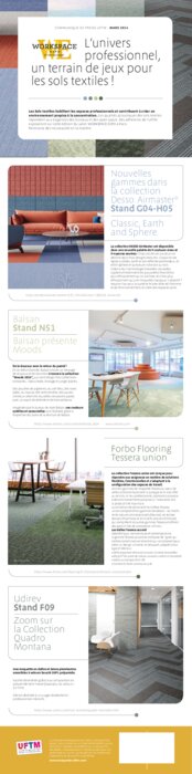 Les Sols textiles habillent les espaces professionnels et contribuent à créer un environnement propice à la concentration. Les qualités acoustiques des sols textiles répondent aux exigences des bureaux et des open space. Des adhérents de l’UFTM exposeront sur cette édition du salon WORKSPACE EXPO à Paris. Panorama des nouveautés en la matière.