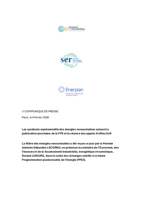 La filière des énergies renouvelables a été reçue ce jour par le Premier ministre Sébastien LECORNU, en présence du ministre de l’Économie, des Finances et de la Souveraineté industrielle, énergétique et numérique, Roland LESCURE, dans le cadre des échanges relatifs à la future Programmation pluriannuelle de l’énergie (PPE3).