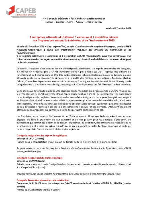 La CAPEB Auvergne-Rhône-Alpes a remis ses traditionnels Trophées des artisans du Patrimoine et de l’Environnement.