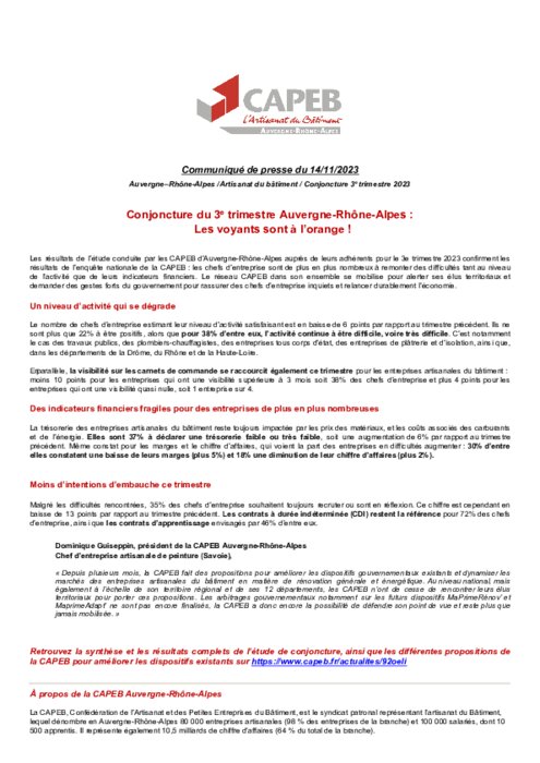 Les résultats de l’étude conduite par les CAPEB d’Auvergne-Rhône-Alpes auprès de leurs adhérents pour le 3e trimestre 2023 confirment les résultats de l’enquête nationale de la CAPEB : les chefs d’entreprise sont de plus en plus nombreux à remonter des difficultés tant au niveau de l’activité que de leurs indicateurs financiers.