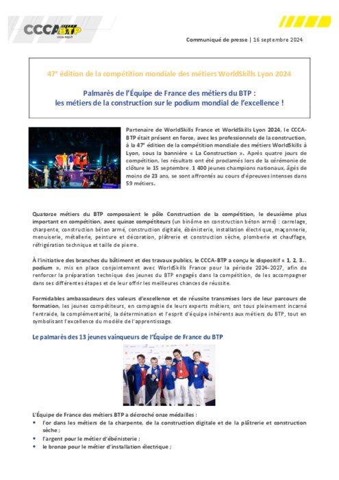 Partenaire de WorldSkills France et WorldSkills Lyon 2024, le CCCA-BTP était présent en force, avec les professionnels de la construction, à la 47e édition de la compétition mondiale des métiers WorldSkills à Lyon, sous la bannière « La Construction ». Après quatre jours de compétition, les résultats ont été proclamés lors de la cérémonie de clôture le 15 septembre. 1 400 jeunes champions nationaux, âgés de moins de 23 ans, se sont affrontés au cours d’épreuves intenses dans 59 métiers.