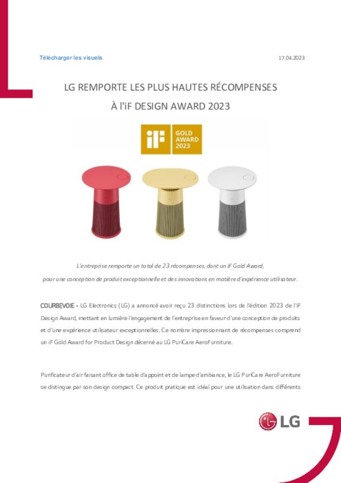 LG Electronics (LG) a annoncé avoir reçu 23 distinctions lors de l'édition 2023 de l'iF Design Award, mettant en lumière l'engagement de l'entreprise en faveur d'une conception de produits et d'une expérience utilisateur exceptionnelles. Ce nombre impressionnant de récompenses comprend un iF Gold Award for Product Design décerné au LG PuriCare AeroFurniture.