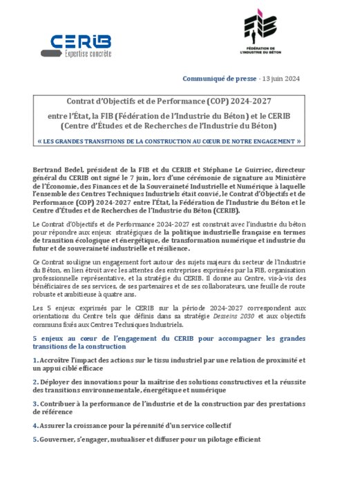 Bertrand Bedel, président de la FIB et du CERIB et Stéphane Le Guirriec, directeur général du Cerib, ont signé le 7 juin, lors d’une cérémonie de signature au Ministère de l’Économie, des Finances et de la Souveraineté Industrielle et Numérique à laquelle l’ensemble des Centres Techniques Industriels était convié, le Contrat d’Objectifs et de Performance (COP) 2024-2027 entre l’État, la Fédération de l’Industrie du Béton et le Centre d’Études et de Recherches de l’Industrie du Béton (Cerib).