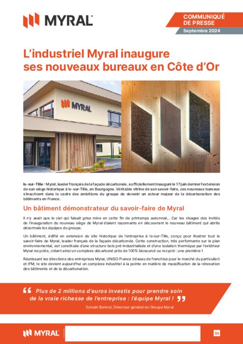 Myral, leader français de la façade décarbonée, a officiellement inauguré le 17 juin dernier l’extension de son siège historique à Is-sur-Tille, en Bourgogne. Véritable vitrine de son savoir-faire, ces nouveaux bureaux s’inscrivent dans le cadre des ambitions du groupe de devenir un acteur majeur de la décarbonation des bâtiments en France.