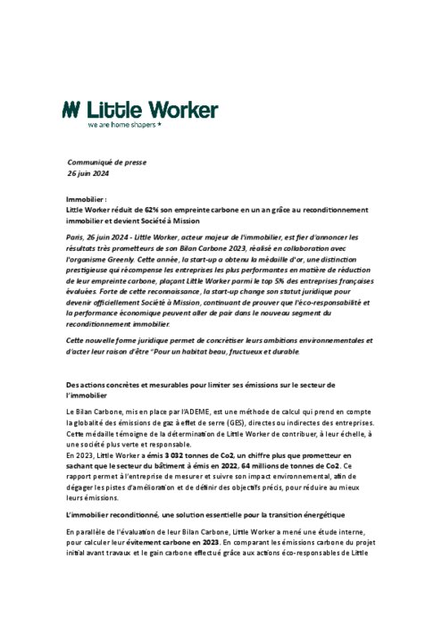 Little Worker, acteur majeur de l'immobilier, est fier d’annoncer les résultats très prometteurs de son Bilan Carbone 2023, réalisé en collaboration avec l'organisme Greenly. Cette année, la start-up a obtenu la médaille d'or, une distinction prestigieuse qui récompense les entreprises les plus performantes en matière de réduction de leur empreinte carbone, plaçant Little Worker parmi le top 5% des entreprises françaises évaluées.