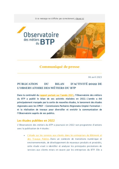 Dans la continuité du rapport portant sur l’année 2021, l’Observatoire des métiers du BTP a publié le bilan de ses activités réalisées en 2022. L’année a été principalement marquée par la sortie de nouvelles études, le lancement des études régionales avec les CPREF – Commissions Paritaires Régionales Emploi-Formation - et la réalisation de travaux pour diversifier et enrichir la communication de l’Observatoire auprès de ses publics.