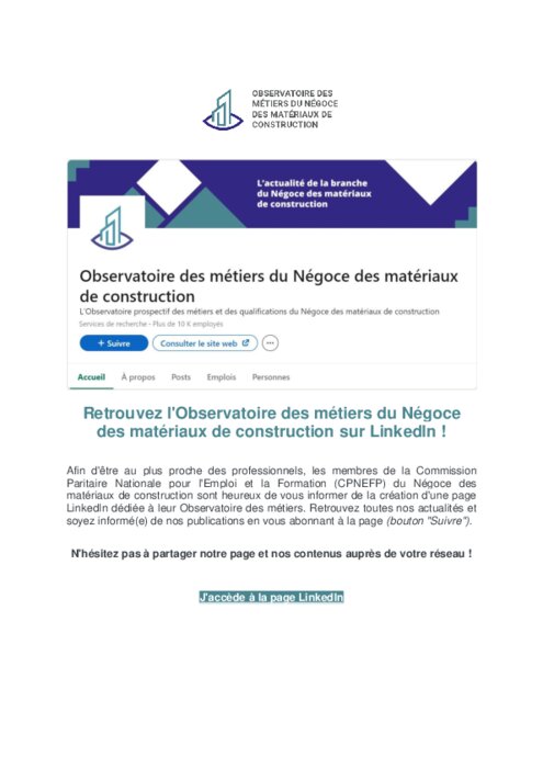Afin d'être au plus proche des professionnels, les membres de la Commission Paritaire Nationale pour l'Emploi et la Formation (CPNEFP) du Négoce des matériaux de construction sont heureux de vous informer de la création d'une page LinkedIn dédiée à leur Observatoire des métiers.