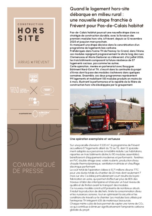 Préfabriqués dans l’usine TH de Fresnoy-le-Grand, dans l’Aisne, ces modules rejoignent progressivement le site le long des rues Clemenceau et Marie Deslavier où s’élèveront, d’ici juillet 2026, les trois bâtiments composant la future résidence de 57 logements sociaux, pas comme les autres.
