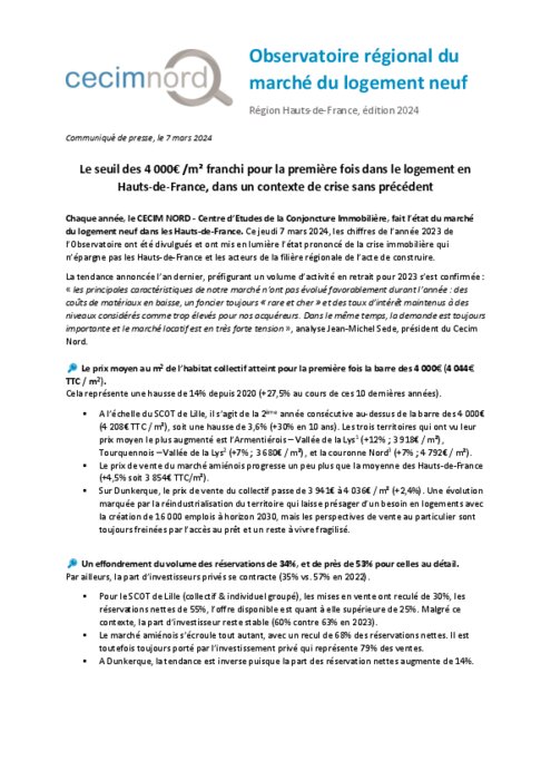Chaque année, le CECIM NORD - Centre d’Etudes de la Conjoncture Immobilière, fait l’état du marché du logement neuf dans les Hauts-de-France. Ce jeudi 7 mars 2024, les chiffres de l’année 2023 de l’Observatoire ont été divulgués et ont mis en lumière l’état prononcé de la crise immobilière qui n’épargne pas les Hauts-de-France et les acteurs de la filière régionale de l’acte de construire.