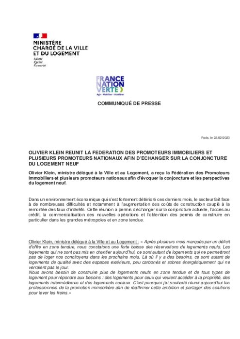 Institutionnels 22 février 2023 - 10:20 Olivier Klein, ministre délégué à la Ville et au Logement, a reçu la Fédération des Promoteurs Immobiliers et plusieurs promoteurs nationaux afin d’évoquer la conjoncture et les perspectives du logement neuf. PDF (162 Ko) Télécharger