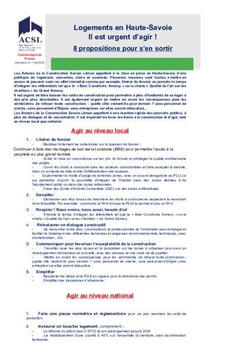 Les Acteurs de la Construction Savoie Léman appellent à la mise en place en Haute-Savoie, d’une politique du logement, concertée, claire et assumée. Plusieurs mesures sont faciles à mettre en œuvre et peuvent avoir un effet immédiat comme par exemple, libérer du foncier ou prendre le temps d’intégrer les référentiels tel que le « Bien Construire Annecy » ou la charte « Qualité de l’air sur les chantiers » du Grand Annecy.