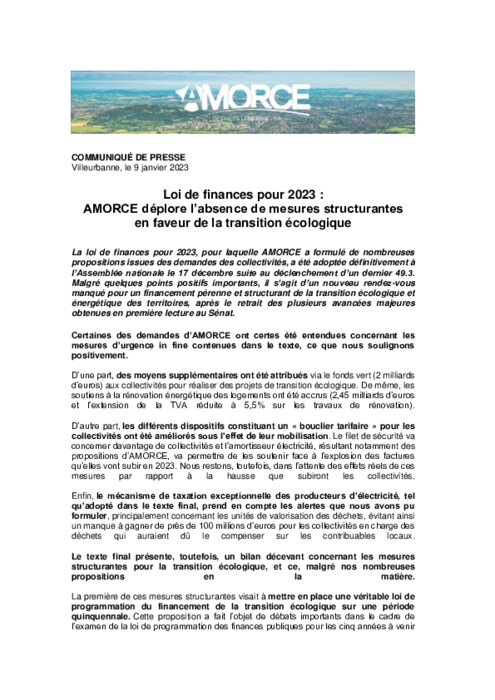 La loi de finances pour 2023, pour laquelle AMORCE a formulé de nombreuses propositions issues des demandes des collectivités, a été adoptée définitivement à l’Assemblée nationale le 17 décembre suite au déclenchement d’un dernier 49.3. Malgré quelques points positifs importants, il s’agit d’un nouveau rendez-vous manqué pour un financement pérenne et structurant de la transition écologique et énergétique des territoires.