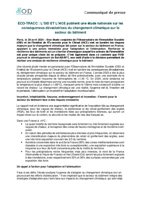 Une étude conjointe de l’Observatoire de l’Immobilier Durable (OID) et de l’Institut de l’Économie pour le Climat (I4CE) met en lumière les risques majeurs que le changement climatique fait peser sur le secteur du bâtiment en France, appelant à une action immédiate pour l'adaptation et l'atténuation. Renforcer la résilience des bâtiments est un chantier d’envergure auquel les acteurs de l’immobilier ont pour unique choix de se préparer. C’est également dans ce contexte que l’OID poursuit le développement de Bat-ADAPT, son outil d’aide à la décision permettant de réaliser une analyse de résilience climatique pour le bâtiment.