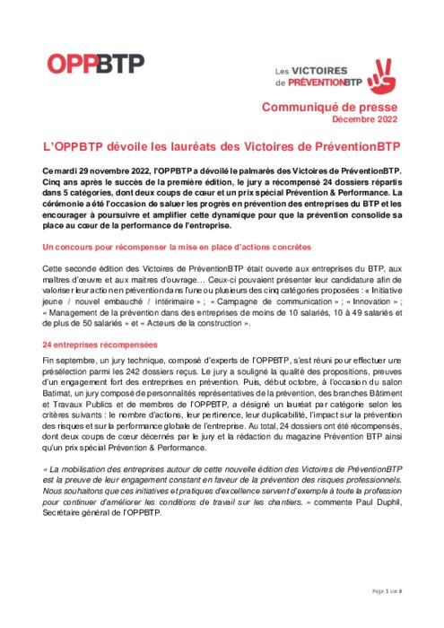 Ce mardi 29 novembre 2022, l’OPPBTP a dévoilé le palmarès des Victoires de PréventionBTP. Cinq ans après le succès de la première édition, le jury a récompensé 24 dossiers répartis dans 5 catégories, dont deux coups de cœur et un prix spécial Prévention & Performance. La cérémonie a été l’occasion de saluer les progrès en prévention des entreprises du BTP et les encourager à poursuivre et amplifier cette dynamique pour que la prévention consolide sa place.
