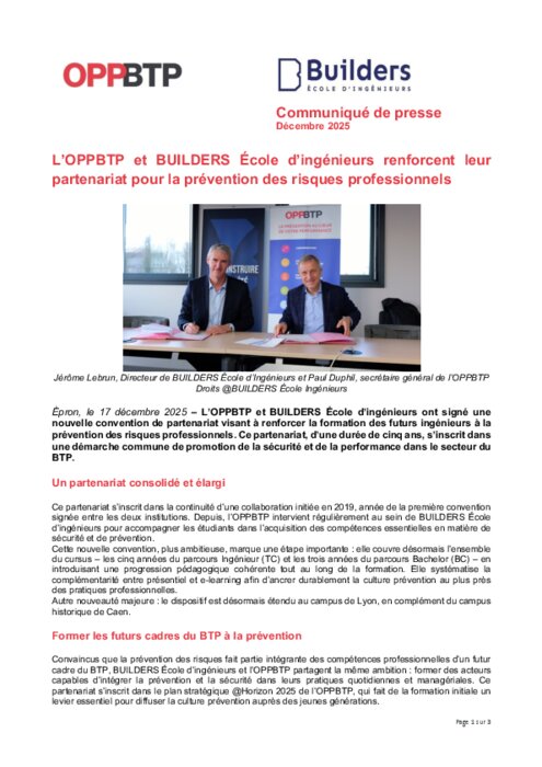 Ce partenariat s’inscrit dans la continuité d’une collaboration initiée en 2019, année de la première convention signée entre les deux institutions. Depuis, l’OPPBTP intervient régulièrement au sein de BUILDERS École d’ingénieurs pour accompagner les étudiants dans l’acquisition des compétences essentielles en matière de sécurité et de prévention.