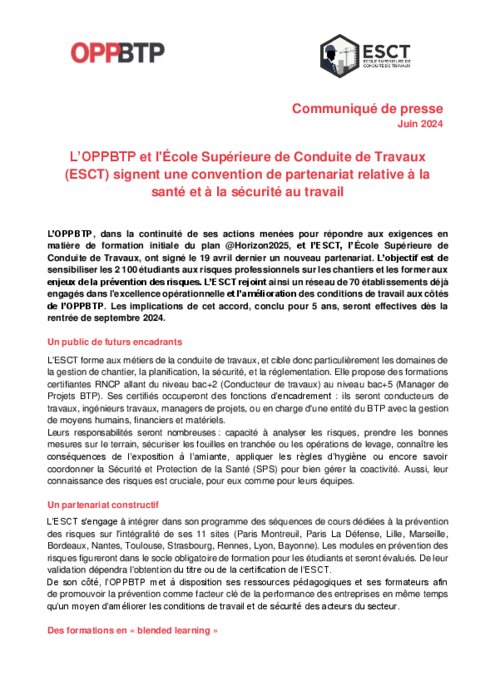 L’OPPBTP, dans la continuité de ses actions menées pour répondre aux exigences en matière de formation initiale du plan @Horizon2025, et l’ESCT, l’École Supérieure de Conduite de Travaux, ont signé le 19 avril dernier un nouveau partenariat. L’objectif est de sensibiliser les 2 100 étudiants aux risques professionnels sur les chantiers et les former aux enjeux de la prévention des risques.