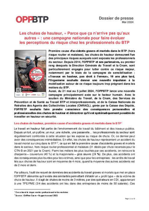 Du 21 mai au 5 juillet 2024, l’OPPBTP lance une nouvelle campagne principalement axée sur le facteur humain. Avec le soutien du Ministère du Travail, de la Cnam, des Services de Prévention et de Santé au Travail BTP et interprofessionnels, et de la Caisse Nationale de Retraites des Agents des Collectivités Locales (CNRACL), gérée par la Caisse des Dépôts, l’OPPBTP souhaite faire prendre conscience des conséquences personnelles et professionnelles des chutes de hauteur et démontrer qu’il est systématiquement possible de travailler en hauteur en sécurité.