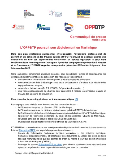 Dans son plan stratégique quinquennal @Horizon2025, l’Organisme professionnel de prévention du bâtiment et des travaux publics (OPPBTP) prévoit de déployer auprès des entreprises du BTP des départements d’outre-mer un service équivalent à celui dont bénéficient leurs homologues de l’hexagone. Après des campagnes de prévention à Mayotte et en Guadeloupe, l’OPPBTP organise une quinzaine prévention BTP en Martinique du 13 au 24 novembre 2023.