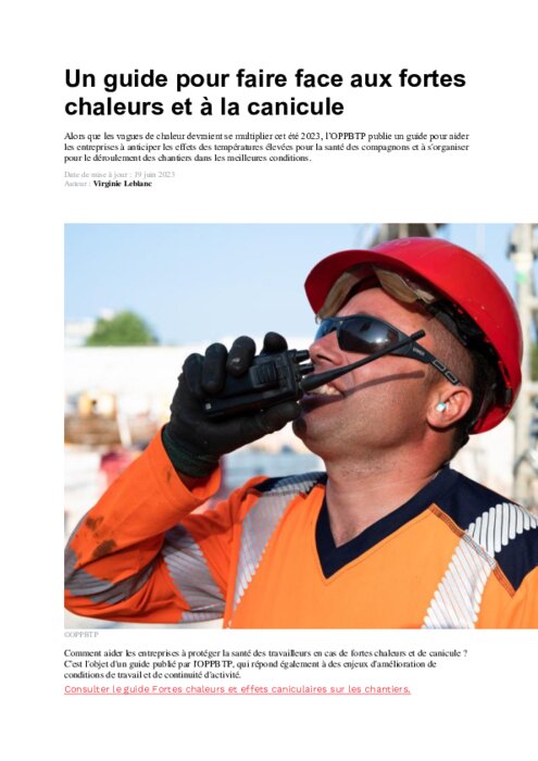 Alors que les vagues de chaleur devraient se multiplier cet été 2023, l’OPPBTP publie un guide pour aider les entreprises à anticiper les effets des températures élevées pour la santé des compagnons et à s'organiser pour le déroulement des chantiers dans les meilleures conditions.