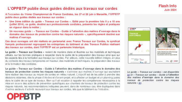 Institutionnels 27 juin 2024 - 09:33 A l’occasion du 11ème Championnat de France Cordistes, les 27 et 28 juin à Marseille, l’OPPBTP publie deux guides dédiés aux travaux sur cordes. PDF (211 Ko) Télécharger