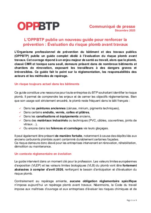 L’Organisme professionnel de prévention du bâtiment et des travaux publics (OPPBTP) publie un guide complet dédié à l’évaluation du risque plomb avant travaux. Cet ouvrage répond à un enjeu majeur de santé au travail, alors que le plomb, classé CMR et toxique sans seuil, demeure présent dans de nombreux bâtiments et chantiers de rénovation, exposant les travailleurs à des dangers graves et irréversibles. Ce guide fait le point sur la réglementation, les responsabilités des acteurs et les méthodes de repérage.