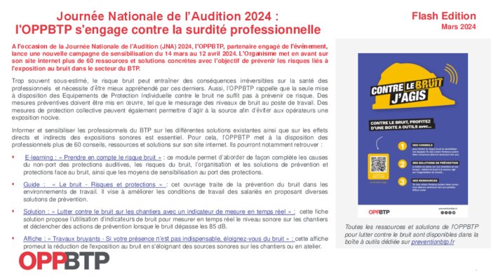 A l’occasion de la Journée Nationale de l'Audition (JNA) 2024, l’OPPBTP, partenaire engagé de l’événement, lance une nouvelle campagne de sensibilisation du 14 mars au 12 avril 2024. L’Organisme met en avant sur son site internet plus de 60 ressources et solutions concrètes avec l'objectif de prévenir les risques liés à l'exposition au bruit dans le secteur du BTP.