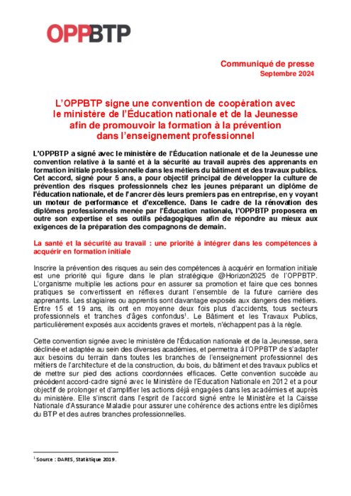 L’OPPBTP a signé avec le ministère de l'Éducation nationale et de la Jeunesse une convention relative à la santé et à la sécurité au travail auprès des apprenants en formation initiale professionnelle dans les métiers du bâtiment et des travaux publics. Cet accord, signé pour 5 ans, a pour objectif principal de développer la culture de prévention des risques professionnels chez les jeunes préparant un diplôme de l’éducation nationale, et de l’ancrer dès leurs premiers pas en entreprise, en y voyant un moteur de performance et d’excellence.