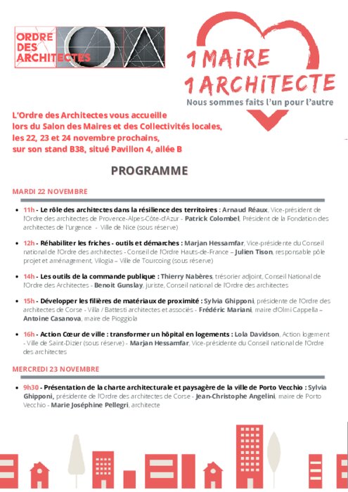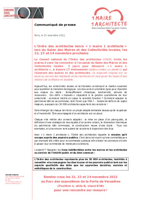 Le Conseil national de l’Ordre des architectes (CNOA) invite les maires à venir rencontrer les architectes au Salon des Maires et des Collectivités locales : 3 jours pour découvrir « 1 maire, 1 architecte », à travers 17 tables-rondes ou ateliers qui réuniront des maires et des architectes. Ce programme, au service des territoires et des habitants, veut poser les bases d’une relation durable et de confiance.